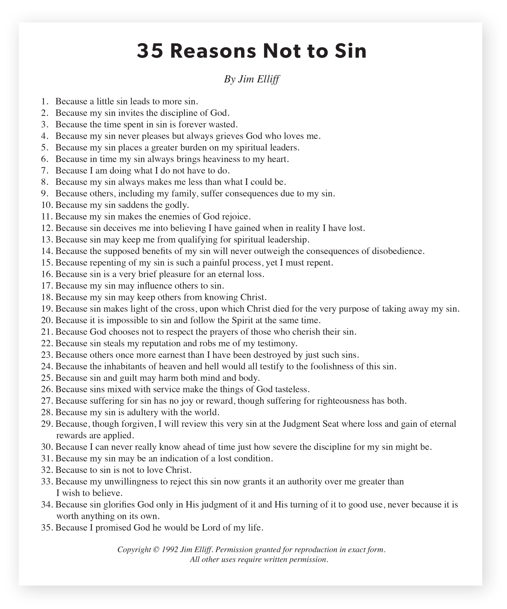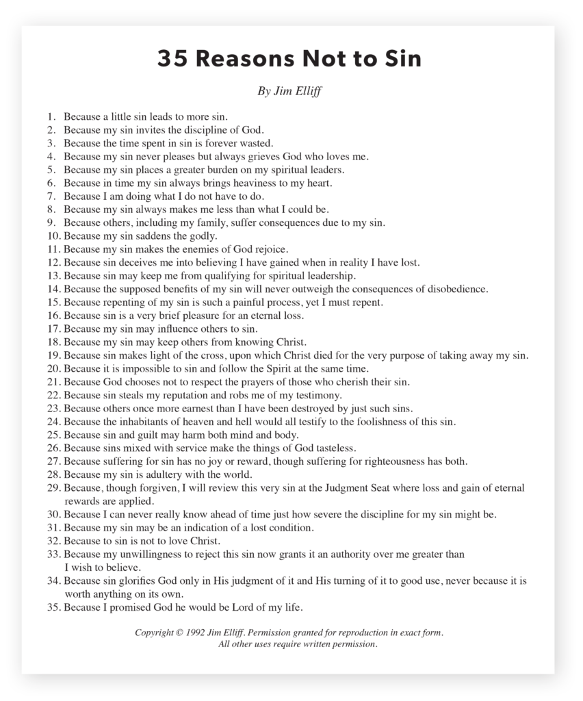Below is a list of “35 Reasons Not to Sin” for the sanctification, blessing, and future effectiveness of all of us who are fully forgiven children of God. Let’s meditate on these often.